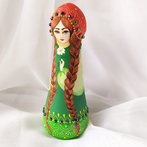 Расписана каждая игрушка мною вручную с использованием качественных стойких акриловых красок. А также я использую кристаллы, имитацию жемчуга, объемную роспись акриловой пастой. Увеличьте изображение и рассмотрите все эти детали. Такую матрешку очень приятно держать в руках, ведь ее фактура дает необыкновенные ощущения ладоням.