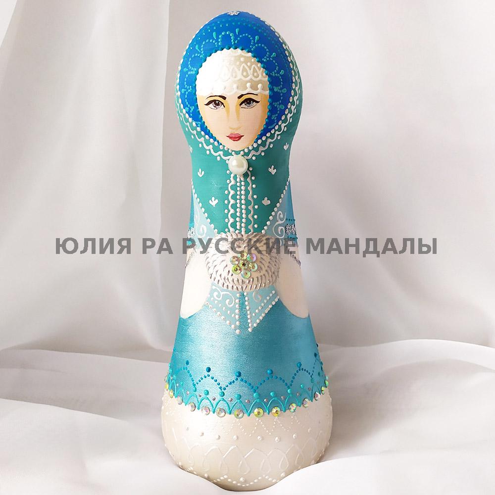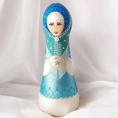 Расписана каждая игрушка мною вручную с использованием качественных стойких акриловых красок. А также я использую кристаллы, имитацию жемчуга, объемную роспись акриловой пастой. Увеличьте изображение и рассмотрите все эти детали. Такую матрешку очень приятно держать в руках, ведь ее фактура дает необыкновенные ощущения ладоням.
