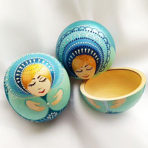 Форма разборная, выточена из дерева по авторскому эскизу. Расписана вручную с использованием стойких акриловых материалов. Использована точечная роспись, что делает матрешку очень интересной наощупь