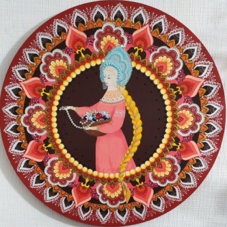 Но идея эта не давала покоя, на белый свет просилась новая Царевна Богатства. Как раз приобрела круглый холст, хотелось попробовать с ним поработать….. Так родилась вторая Царевна, что на фото-визитке этой статьи