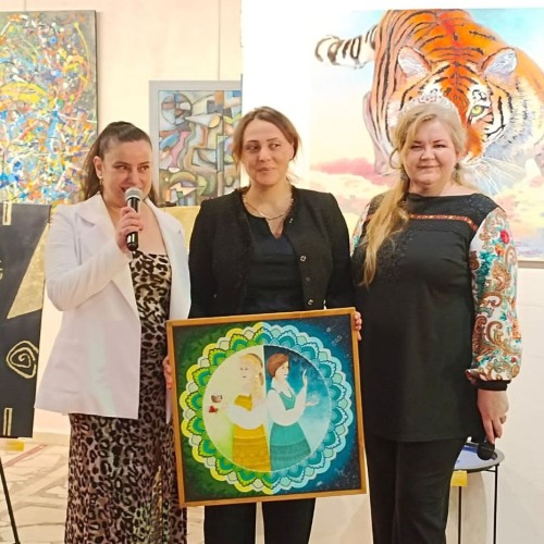 На эту выставку я приехала с пятью оригиналами своих работ. А также во время концертной программы провела вручение картины, которую специально создала для проекта "Женщины в науке"