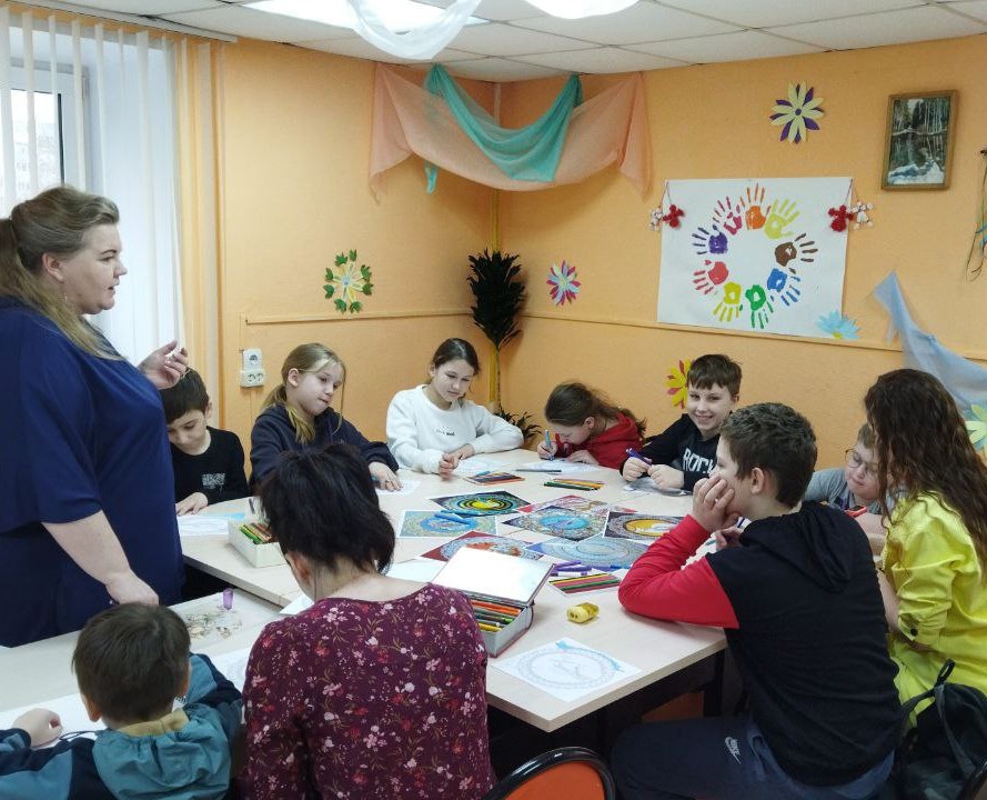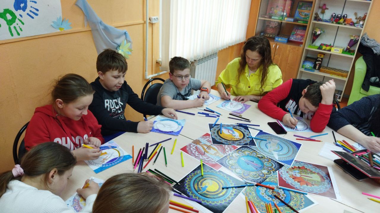 То ли мандала незаметно делала своё дело...то ли я смогла найти подход.....то ли сыграло роль то, что большая часть ребят закончила работу и ушла...... Наш Илья увлёкся процессом. Он уже меньше болтал. Рисовал активно. И реально создавал свой мир.