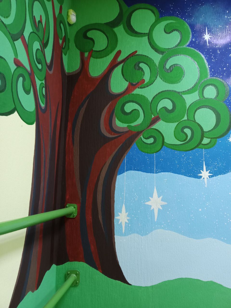 С администратором Центра Еленой Лаптевой и при поддержке друзей мы за три недели превратили бывший детский сад в яркое красивое арт-пространство. Расписали стены, усьановили системы подвеса картин, разместили выставку.