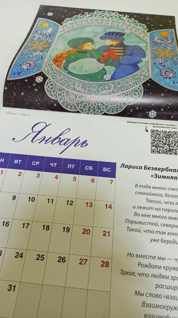 Удобный формат, классное качество. И снова, как в первых моих календарях, крупная календарная сетка, где удобно делать заметки. Хорошая бумага. Чёткая печать. Соскучилась я по такому качеству.