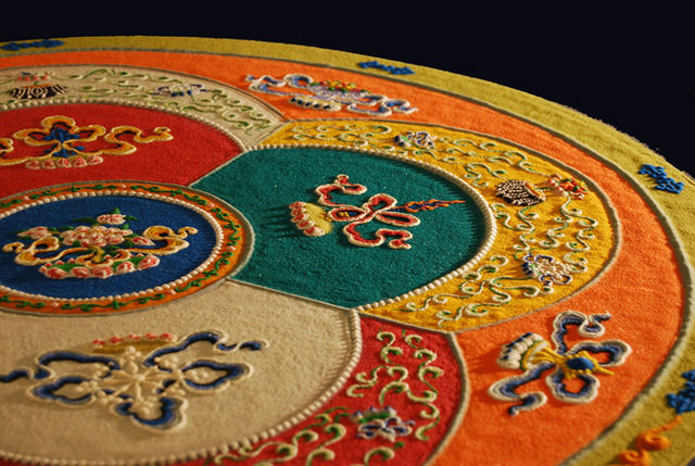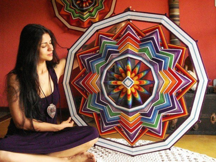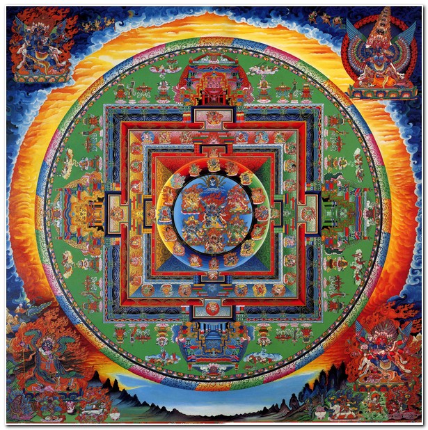 От санскрита мандала означает "круг". В классическом исполнении в круг (Вселенная) вписан квадрат (обитель божеств), а в нем еще один круг или лотос (душевное равновесие). Это в будизме. Есть еще мандалы индейские, плетеные, они как правило, концентрируются на фигуры на 12 лучей.